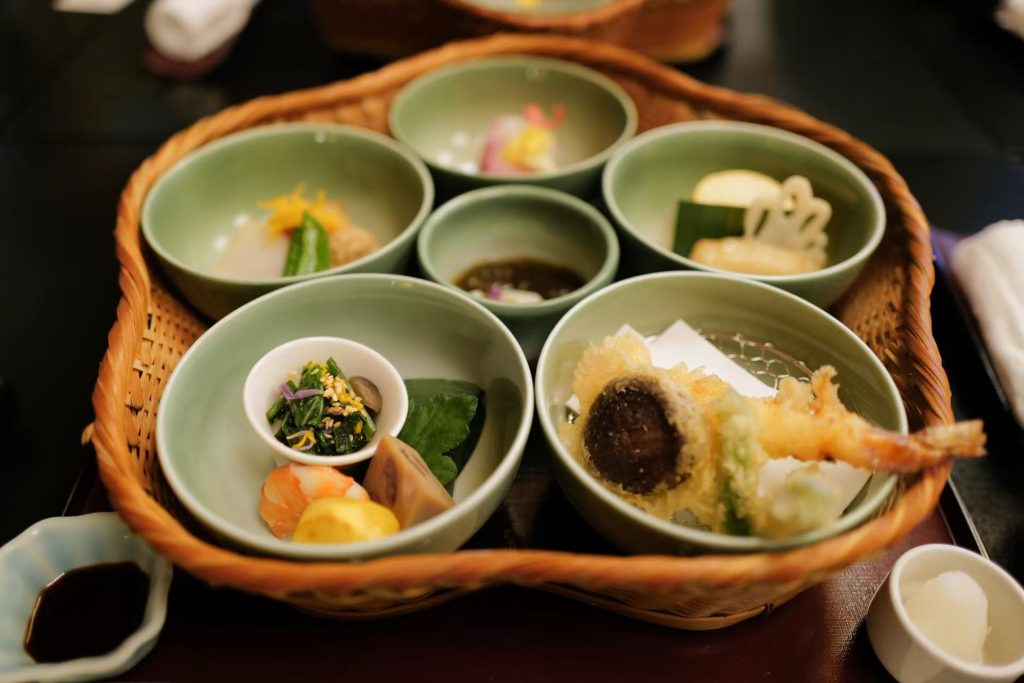 The lunch set is called “Hanakago Gozen” (flower-basket set). Many of the courses you’d normally see in a full kaiseki meal are miniaturized and presented together in one woven “flower basket”: appetizers, dressed dishes, sashimi, simmered items, grilled fish, fried items—each one compressed into its essence.