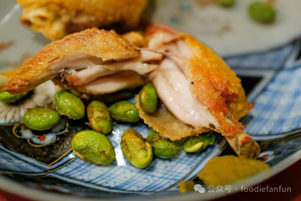 Then comes a plate of karaage so good it almost deserves its own show: the crust is light and crisp, the meat bouncy and juicy, the seasoning precise, the skin tender but not greasy. This is the kind of fried chicken that absolutely has to be eaten hot; the coating holds the aroma, the meat stays springy. It’s a classic izakaya dish, but with a distinct “chef’s touch.” Even the little edamame on the side are full of aroma.