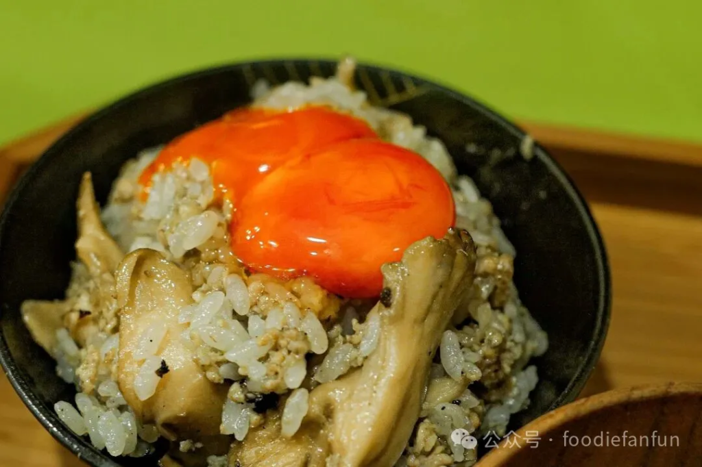 Then a maitake and minced chicken rice. It arrives with a wave of charcoal aroma, and once you mix in the egg yolk on top, everything becomes even smoother and richer. The maitake is fried crisp, the chicken carries obvious smoke and fire.