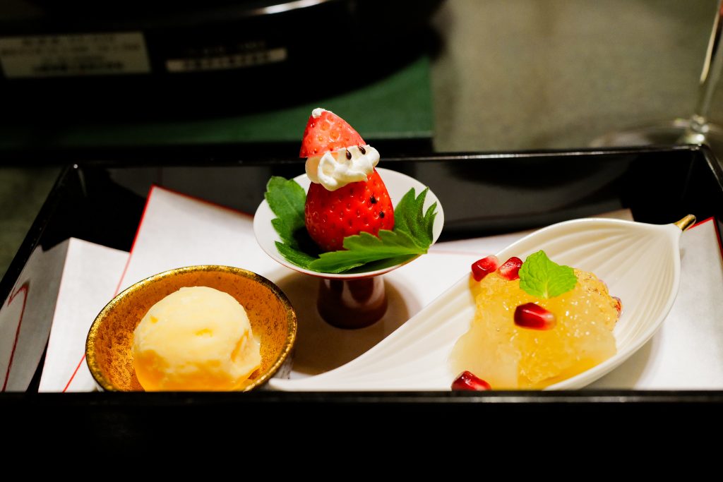 To close, there’s a soft-set blueberry tart and a white chocolate–yomogi warabi mochi.