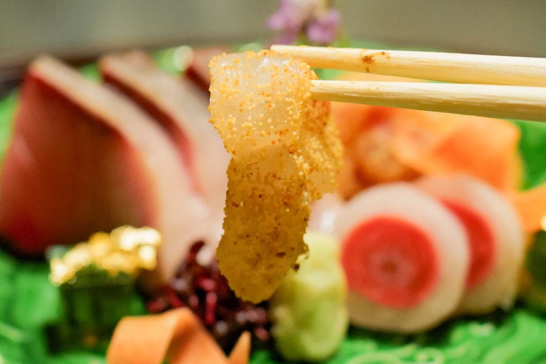 比如用来自全国各地的清酒、甚至自调酒配餐,比如在刺身外裹乌鱼子、比如用豆皮和鸡油的组合替换蛋羹的存在。