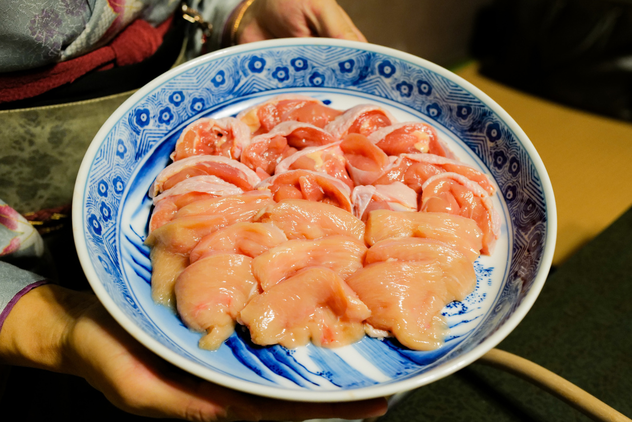 发家的鸡肉火锅是从一碗鸡汤开始的。自家养的鸡肉,取头和脚熬汤,奶香之余带着微微胶质感。配酒端上来加热过的金鵄正宗的「银阁」,女将提示我们可以倒一点在汤里,旨香和鲜度叠在一起,变得更加丰富了。