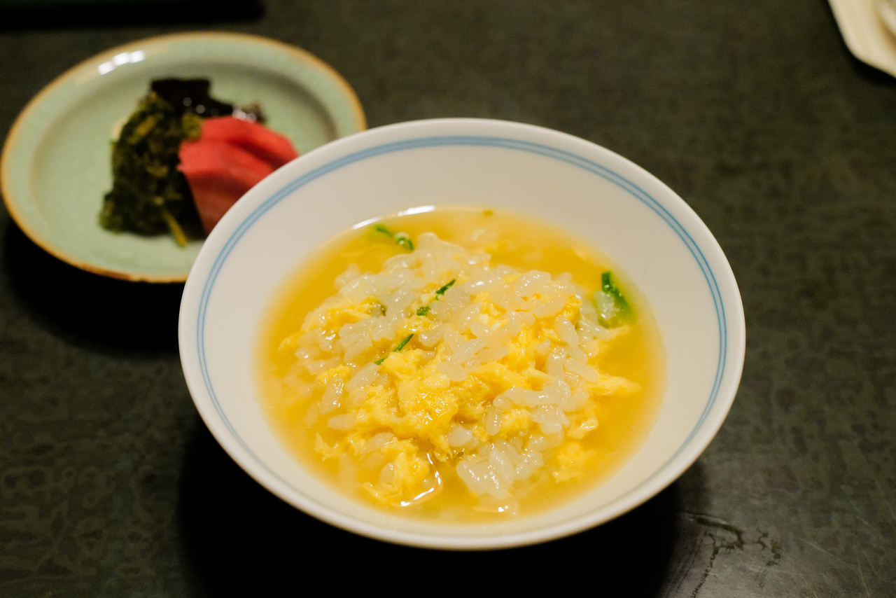 女将把锅底再次煮沸,先是将白饭拨进汤里,用勺背轻轻压散。之后利落的打匀蛋液,沿锅边细细分两三次淋下,随着蛋花舒展开,汤面从乳白转成柔和的金黄。等到再次揭盖那一瞬,蒸汽涌起,鸡汤的香气裹着米甜,直扑鼻尖。